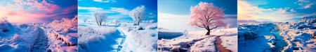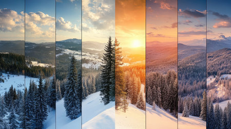 Beautiful winter landscapes collage with snow covered trees, roads, mountains and forests