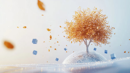 A concept of harmony: a globe with a single tree, golden leaves dancing around, and blue cubes scattered on a clean white background.