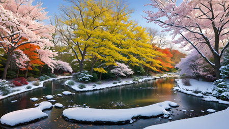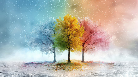 This captivating image showcases vibrant seasonal trees in a snowy landscape, blending colors and textures for a dreamlike atmosphere that captures nature's beauty.