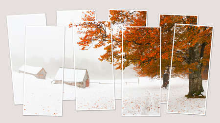 Isolated eight frames collage of picture of first snow in mountain farm. Splendid autumn view of snowy Carpathian mountains. Mock-up of modular photo.
