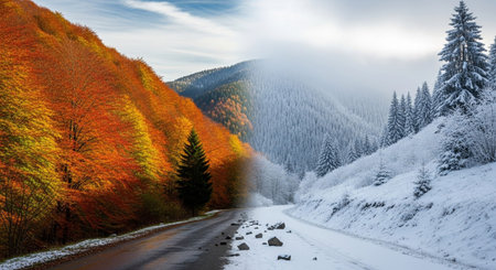 A split showcases the dramatic transition between autumn and winter. On the left, a winding asphalt road cuts through a vibrant forest ablaze with fiery orange, yellow, and red foliage. On the right, the same landscape is transformed by a blanket of pristine white snow, with evergreen trees dusted in frost and a soft mist obscuring the distant mountains. The contrast highlights the stark beauty of seasonal change.