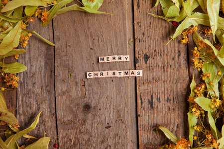 Autumn writing word arranged by autumn leaves and red berries. Seasonal floral fall decoration. Colorful wooden letters