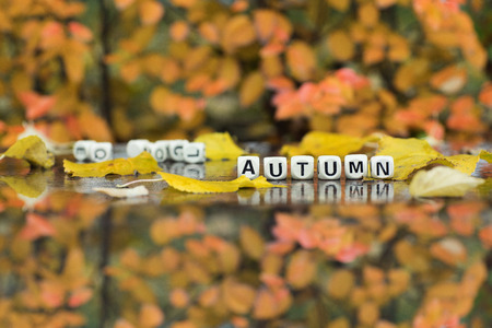 The inscription in white letters the word AUTUMN on a background of yellow leaves on the grass in the autumn forest
