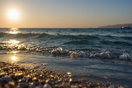 Calm ocean waves gently ripple under the warm sunlight, creating beautiful reflections on the water's surface near a picturesque shoreline. Perfect for summer vibes.
