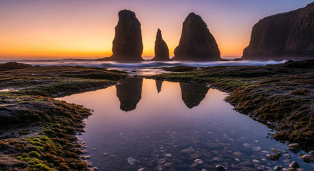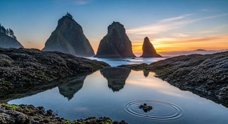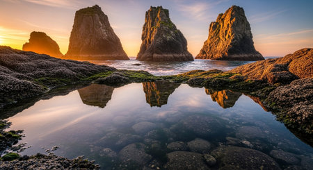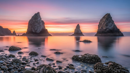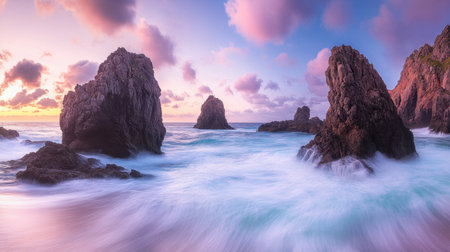 A captivating coastal scene featuring majestic rock formations rising from gentle waves, bathed in the soft colors of sunset, evoking tranquility and natural beauty.