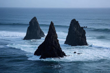 Dramatic sea stacks rising from rugged coastline amidst crashing ocean waves