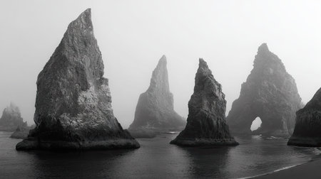A haunting view of dark, sharp rock formations rising from turbulent ocean waters. The entire scene is enveloped in a dense, atmospheric fog, creating a moody and mysterious landscape.