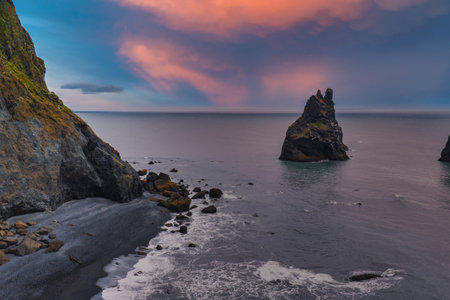 Rocks of Dyrholaey peninsula in colorful sunset, Iceland