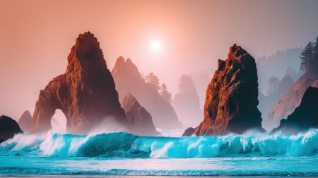 A breathtaking coastal landscape with majestic sea stacks silhouetted against a glowing sunset. Powerful turquoise waves crash on the shore in a misty, ethereal atmosphere.