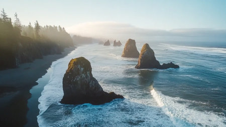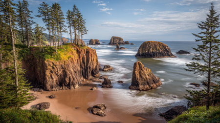 This atmospheric coastal scene captures unique rock formations emerging from a tranquil ocean, enveloped in a gentle fog. Pine trees line the shore, enhancing the serene landscape.