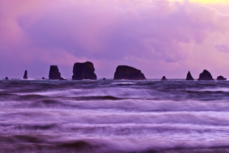 Dusk or sunset at Cannon Beach with shoreline and silhouetted sea stacks, Oregon Coast scenery or landscape, Usa.