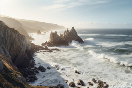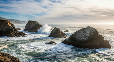 A serene view of the Pacific coastline with cliffs and crashing waves. No people, copy space.