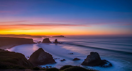 AI Generated. A captivating seascape with a stunning sunset over a vast ocean and majestic rocks