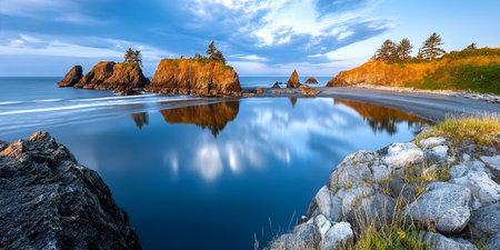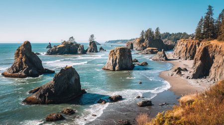 This captivating coastal scene features rugged rock formations alongside tranquil waters and a clear blue sky, showcasing the beauty of nature in the Pacific Northwest.