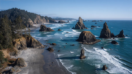 A breathtaking view of a secluded sandy beach along the Pacific coast, featuring dramatic sea stacks, rugged cliffs, and a lush evergreen forest under a partly cloudy sky.