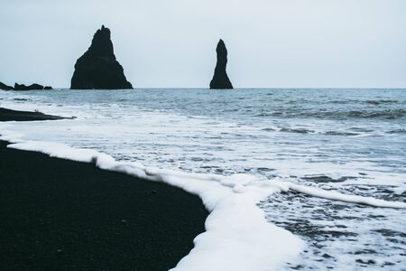 Famous view on Reynisfjara beach in Iceland. Black sand and white foam