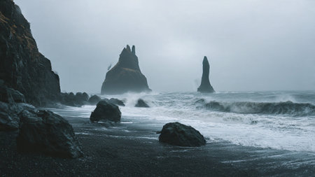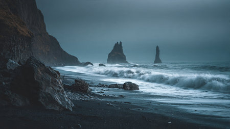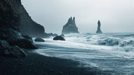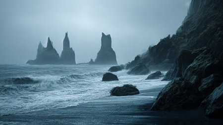 Foggy day at Reynisfjara beach, Iceland. Toned.