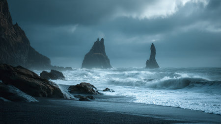 AI Generated. Dark Ocean Scene with Towering Rock Formations