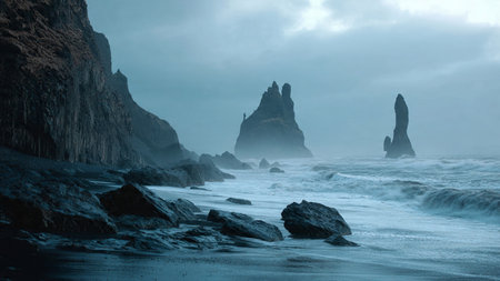 Black sand beach in the fog. Beautiful seascape. Toned.