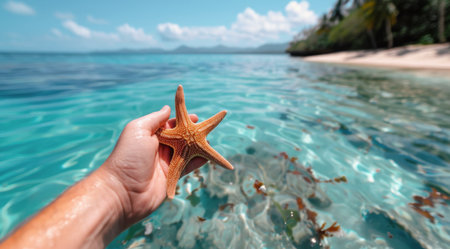 A person is holding a vibrant starfish above crystal-clear water, surrounded by soft sand and lush greenery in a tropical setting while enjoying a sunny day by the beach.