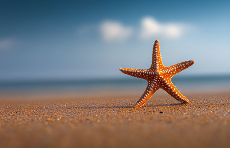 A solitary starfish lies on the smooth sand of a beach, facing the ocean. Gentle waves lapping at the shore create a tranquil atmosphere under a bright blue sky with a few clouds.