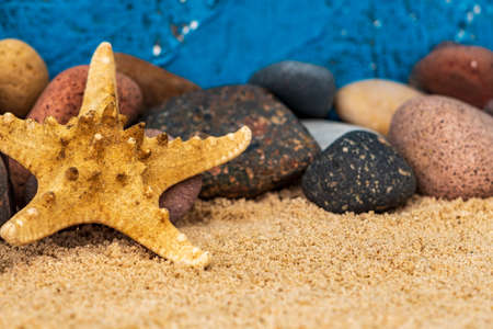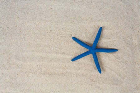 Summer sand beach background. Blue starfish and sea. Summer concept.