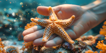 Hand gently holding vibrant orange starfish underwater surrounded by coral and sparkling particles.