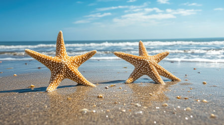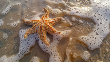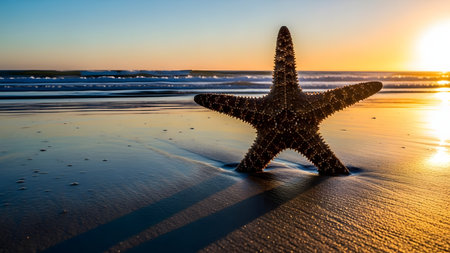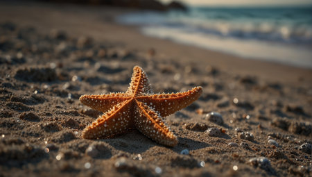 A stunning close-up of a starfish resting on the wet sand by the shore, illuminated by soft sunlight, showcasing nature's beauty and marine diversity.