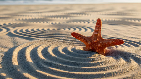 An orange starfish is placed upright in the center of concentric circular patterns drawn in the beach sand. The warm sunlight casts long shadows, enhancing the texture of the sand ripples. This concept image evokes feelings of zen, relaxation, and summer vacations.
