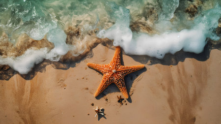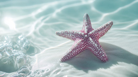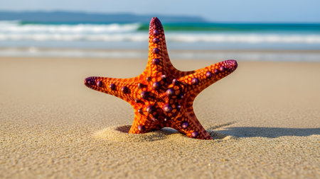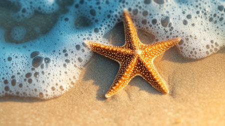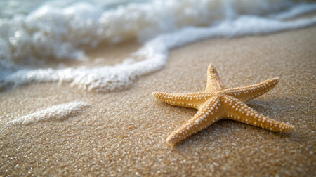 A starfish lies on the soft sand, surrounded by warm grains and gentle ocean waves, capturing a peaceful moment at midday under the bright sun.