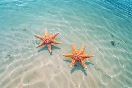 A serene image capturing two bright orange starfish floating on a tranquil blue water surface, surrounded by gentle ripples and soft sunlight.