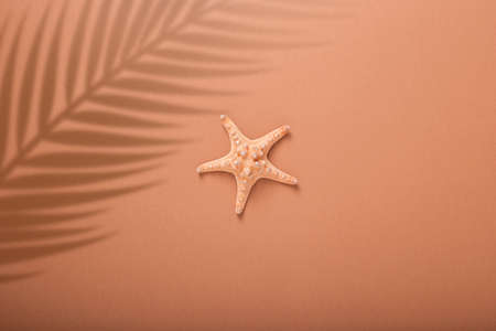 Starfish under the shadow of palm leaves on a white background. Top view, flat lay