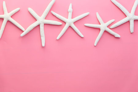 Vibrant Orange Starfish Arranged on Soft Pink Background with Seashells for Coastal and Nature Themed Designs and Decor Projects
