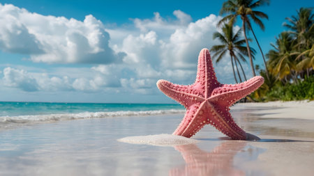 the main focus is on a large, detailed starfish partially submerged in the clear, shallow waters off the coast. the water is crystal clear and turquoise in color, indicating the tropical location. in the background several palm trees are seen swaying slightly to indicate a gentle breeze. the sky is partly cloudy with large fluffy clouds; however, it is generally bright and sunny, creating the perfect atmosphere. the sand on the beach appears flawless and white, which contrasts beautifully with the blue of the ocean