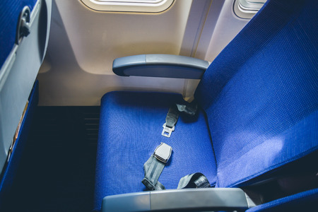 Opened seat belt in an old airplane with empty seat - Security concept