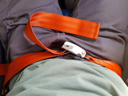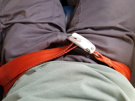 Close-up carabiners locked on safety belt on human model, a safety tools equipment for work at high