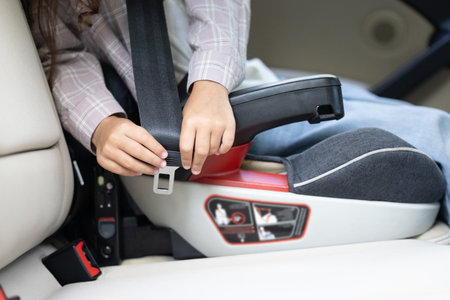 Hands of a little girl lie on the seat belt buckle of a child seat. Close-up