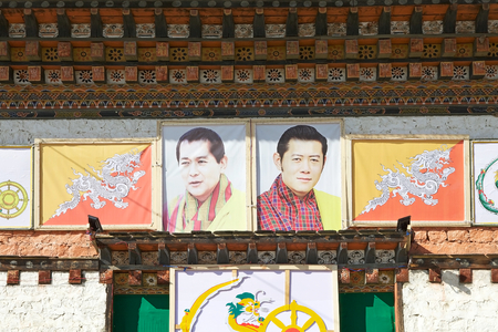 The 4th and 5th King of Bhutan image, Jigme Singye Wangchuck and Jigme khesar Namgyel Wangchuck, on the facade of a traditional building at the Jakar village, Bhutan.