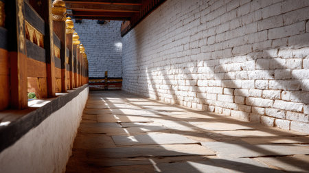 A serene interior view showcasing traditional architecture with wooden flooring. Sunlight casts beautiful shadows on the white brick walls, creating a tranquil atmosphere.