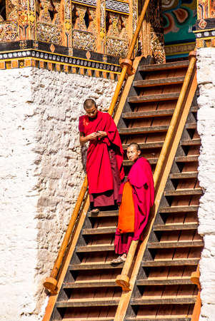 Buddhist monks are standing on the stairs, that go steeply up to the dzong of Punakha, Bhutan. Dzongs are fortress like buildings which house a monastery and administrative offices.