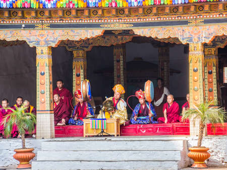 Thimpu, September 22nd, 2007: Unidentified people in traditional dress by benediction of the festivity in the Trashichhod Tshechu-Dzong Thimpu Dzong