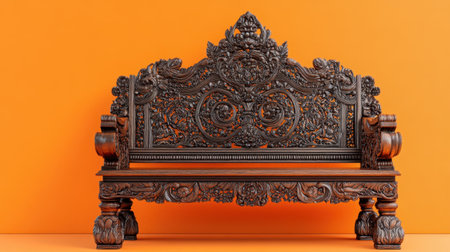 A beautifully crafted wooden bench features intricate carvings that showcase exceptional craftsmanship against a striking orange background, highlighting its elegance.