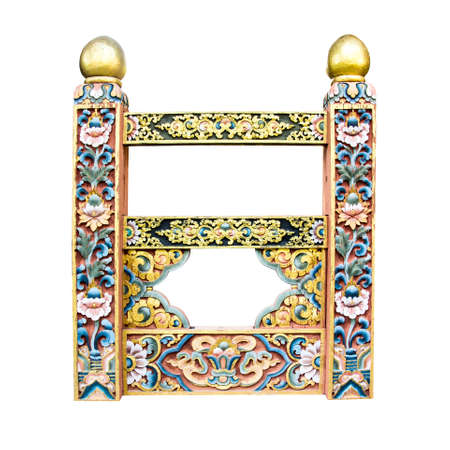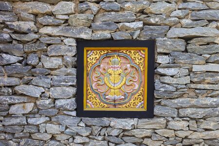 Traditional Bhutan wood carving wall decorate in stone wall, outdoor day light