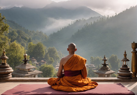 Serene Monk Meditating in Mountainous Landscape During Early Morning Light With Lush Greenery