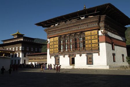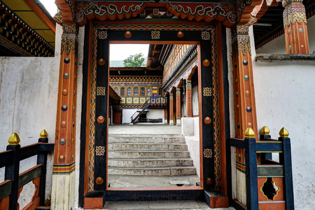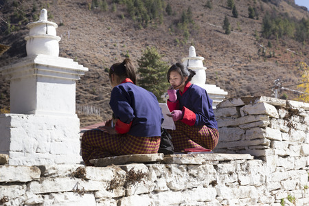 PARO, BHUTAN - DECEMBER 3, 2013: two unidentified girls study in front of the entrance to the Rinpung Dzong on december 3, 2013 in Paro, Bhutan.