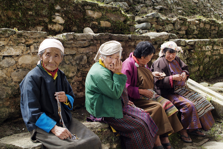 Jakar, Bhutan - September 26, 2007: Unidentified old weman in traditional clothes named Kira rest after visiting Wangduchoeling monastery