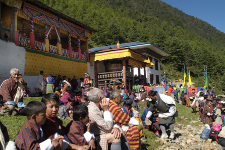 Haa, Bhutan - September 21, 2007: Unidentified people watching religious ceremony named Tshechu at Karpo Lhakhang in Haa village