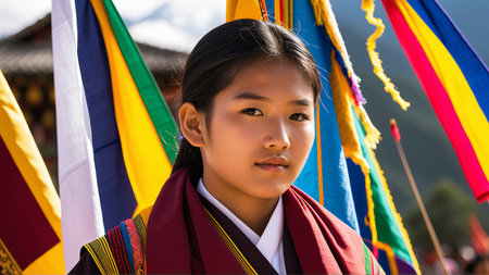 This captivating image features a traditional Bhutanese courtyard, showcasing intricate architecture, surrounded by lush greenery and tranquil sunlight.