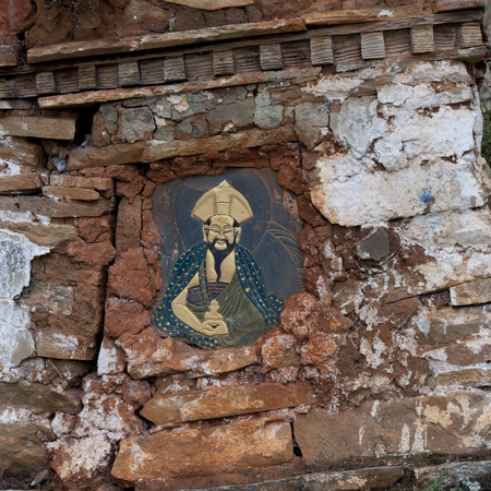 Close-up of a painting on a weathered wall of Zurig Dzong, Paro Valley, Paro District, Bhutan