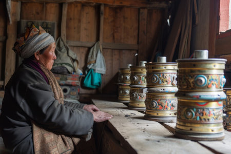 A Tibetan Buddhist spinning prayer wheels in a mountain monastery, symbolizing the continuous flow of prayers.